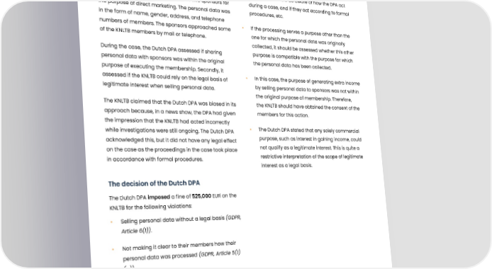 Tennis association fined for selling personal data Summary Our remarks The Dutch tennis association KNLTB sold personal data • A controller should be aware of how the DPA act about more than 300,000 members to two sponsors for during a case, and if they act according to formal the purpose of direct marketing. The personal data was procedures, etc. in the form of name, gender, address, and telephone numbers of members. The sponsors approached some • If the processing serves a purpose other than the of the KNLTB members by mail or telephone. one for which the personal data was originally collected, it should be assessed whether this other During the case, the Dutch DPA assessed if sharing purpose is compatible with the purpose for which personal data with sponsors was within the original the personal data has been collected. purpose of executing the membership. Secondly, it assessed if the KNLTB could rely on the legal basis of • In this case, the purpose of generating extra income legitimate interest when selling personal data. by selling personal data to sponsors was not within the original purpose of membership. Therefore, The KNLTB claimed that the Dutch DPA was biased in its the KNLTB should have obtained the consent of the approach because, in a news show, the DPA had given members for this action. the impression that the KNLTB had acted incorrectly while investigations were still ongoing. The Dutch DPA • The Dutch DPA stated that any solely commercial acknowledged this, but it did not have any legal effect purpose, such as interest in gaining income, could on the case as the proceedings in the case took place not qualify as a legitimate interest. This is quite a in accordance with formal procedures. restrictive interpretation of the scope of legitimate interest as a legal basis. The decision of the Dutch DPA The Dutch DPA imposed a fine of 525,000 EUR on the KNLTB for the following violations: • Selling personal data without a legal basis (GDPR, Article 6(1)). • Not making it clear to their members how their personal data was processed (GDPR, Article 5(1) (a)). • Processing personal data with a purpose that was incompatible with the original purpose for collection (GDPR, Article 5(1)(b)). Published: 20-12-2019 Journal number: N/A Tags: 01 Legal basis and principles of processing 18