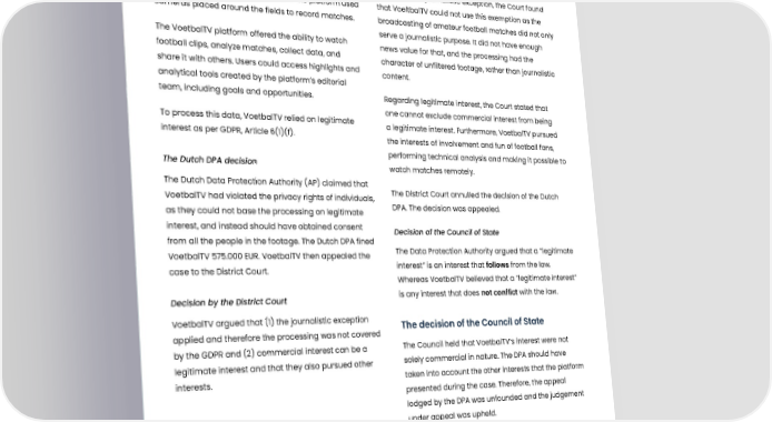 Can commercial interest be a legitimate interest? Summary VoetbalTV was a platform that streamed amateur Regarding the journalistic exception, the Court found football matches in the Netherlands. The platform used that VoeltbalTV could not use this exemption as the cameras placed around the fields to record matches. broadcasting of amateur football matches did not only The VoetbalTV platform offered the ability to watch serve a journalistic purpose. It did not have enough football clips, analyze matches, collect data, and news value for that, and the processing had the share it with others. Users could access highlights and character of unfiltered footage, rather than journalistic analytical tools created by the platform’s editorial content. team, including goals and opportunities. Regarding legitimate interest, the Court stated that To process this data, VoetbalTV relied on legitimate one cannot exclude commercial interest from being interest as per GDPR, Article 6(1)(f). a legitimate interest. Furthermore, VoetbalTV pursued the interests of involvement and fun of football fans, performing technical analysis and making it possible to The Dutch DPA decision watch matches remotely. The Dutch Data Protection Authority (AP) claimed that The District Court annulled the decision of the Dutch VoetbalTV had violated the privacy rights of individuals, DPA. The decision was appealed. as they could not base the processing on legitimate interest, and instead should have obtained consent Decision of the Council of State from all the people in the footage. The Dutch DPA fined The Data Protection Authority argued that a ”legitimate VoetbalTV 575.000 EUR. VoetbalTV then appealed the interest” is an interest that follows from the law. case to the District Court. Whereas VoetbalTV believed that a ”legitimate interest” Decision by the District Court is any interest that does not conflict with the law. Selected interesting cases – VoetbalTV argued that (1) the journalistic exception The decision of the Council of State applied and therefore the processing was not covered Netherlands by the GDPR and (2) commercial interest can be a The Council held that VoetbalTV’s interest were not legitimate interest and that they also pursued other solely commercial in nature. The DPA should have interests. taken into account the other interests that the platform presented during the case. Therefore, the appeal lodged by the DPA was unfounded and the judgement under appeal was upheld. Published: 27-07-2022, Journal number: ECLI:NL:RVS:2022:2173 Tags: 01 Legal basis and principles of processing 27