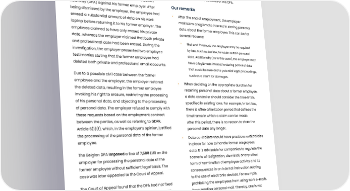 Company fined for restoring data on a former managing director’s work laptop Summary Final decision of the Court of Appeal A former managing director of a private company The Court annulled the decision of the DPA. filed a complaint with the Belgian Data Protection Our remarks Authority (DPA) against his former employer. After being dismissed by the employer, the employee had • After the end of employment, the employer erased a substantial amount of data on his work maintains a legitimate interest in storing personal laptop before returning it to his former employer. The data about the former employee. This can be for employee claimed to have only erased his private several reasons: data, whereas the employer claimed that both private ° First and foremost, the employer may be required and professional data had been erased. During the by law, such as tax law, to retain certain personal investigation, the employer presented two employee data. Additionally (as in this case), the employer may testimonies stating that the former employee had have a legitimate interest in storing personal data deleted both private and professional email accounts. that could be relevant to potential legal proceedings, Due to a possible civil case between the former such as a claim for damages. employee and the employer, the employer restored • When deciding on the appropriate duration for the deleted data, resulting in the former employee retaining personal data about a former employee, invoking his right to erasure, restricting the processing a data controller should consider the time limits of his personal data, and objecting to the processing specified in existing laws. For example, in tort law, of personal data. The employer refused to comply with there is often a limitation period that defines the these requests based on the employment contract timeframe in which a claim can be made. between the parties, as well as referring to GDPR, After this period, there is no reason to store the Article 6(1)(f), which, in the employer’s opinion, justified personal data any longer. the processing of the personal data of the former • Data controllers should have practices and policies employee. in place for how to handle former employees’ The Belgian DPA Imposed a fine of 7,500 EUR on the data. It is advisable for companies to regulate the employer for processing the personal data of the scenario of resignation, dismissal, or any other former employee without sufficient legal basis. The form of termination of employee activity and its case was later appealed to the Court of Appeal. consequences in an internal instruction relating to the use of electronic devices. For example, The Court of Appeal found that the DPA had not fixed prohibiting the employees from using work e-mails the start date of the processing and failed to assess from sending personal mail. Thereby, one is not the legitimate interest of the employer in restoring and in doubt if the e-mails stored are work-related or processing personal data about the former director entirely private. Implementing a policy removes due to the possibility of a civil claim. any potential confusion around the classification of The Court found that the employer had a legitimate stored emails as either work-related or private. interest in restoring and processing the personal data • If e-mails are kept after the end of employment, of the former employee. access to them should be limited to a selected few trusted employees. Published: 07-04-2022 Journal number: DOS-2020-02892 (overturned by 2022/AR/549) Tags: 01 Legal basis and principles 88 of processing, 02 Right of access and obligation to provide information, 03 Right to erasure and rectification