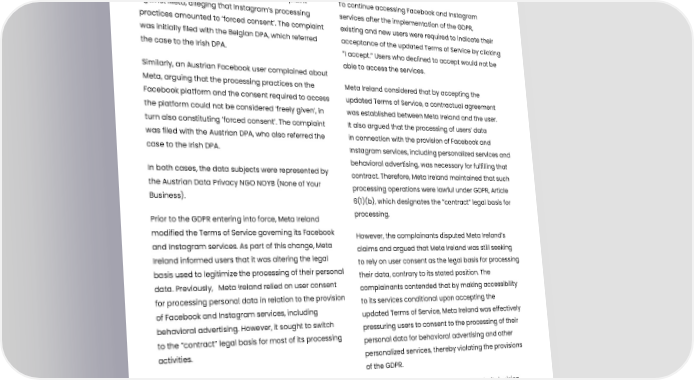 Meta Platforms Ireland Ltd. fined for unlawful data processing Summary In 2018, a Belgian Instagram user filed a complaint To continue accessing Facebook and Instagram against Meta, alleging that Instagram’s processing services after the implementation of the GDPR, practices amounted to ‘forced consent’. The complaint existing and new users were required to indicate their was initially filed with the Belgian DPA, which referred acceptance of the updated Terms of Service by clicking the case to the Irish DPA. ”I accept.” Users who declined to accept would not be able to access the services. Similarly, an Austrian Facebook user complained about Meta, arguing that the processing practices on the Meta Ireland considered that by accepting the Facebook platform and the consent required to access updated Terms of Service, a contractual agreement the platform could not be considered ‘freely given’, in was established between Meta Ireland and the user. turn also constituting ‘forced consent’. The complaint It also argued that the processing of users’ data was filed with the Austrian DPA, who also referred the in connection with the provision of Facebook and case to the Irish DPA. Instagram services, including personalized services and behavioral advertising, was necessary for fulfilling that In both cases, the data subjects were represented by contract. Therefore, Meta Ireland maintained that such the Austrian Data Privacy NGO NOYB (None of Your processing operations were lawful under GDPR, Article Business). 6(1)(b), which designates the ”contract” legal basis for Prior to the GDPR entering into force, Meta Ireland processing. modified the Terms of Service governing its Facebook However, the complainants disputed Meta Ireland’s and Instagram services. As part of this change, Meta claims and argued that Meta Ireland was still seeking Ireland informed users that it was altering the legal to rely on user consent as the legal basis for processing basis used to legitimize the processing of their personal their data, contrary to its stated position. The data. Previously, Meta Ireland relied on user consent complainants contended that by making accessibility for processing personal data in relation to the provision to its services conditional upon accepting the of Facebook and Instagram services, including updated Terms of Service, Meta Ireland was effectively behavioral advertising. However, it sought to switch pressuring users to consent to the processing of their to the ”contract” legal basis for most of its processing personal data for behavioral advertising and other activities. personalized services, thereby violating the provisions of the GDPR. In October 2021, the Irish DPA issued a draft decision, which received objections from ten other DPAs. Subsequently, the cases were referred to the European Data Protection Board, which adopted a binding decision on 5 December 2022. The Irish DPA published the final decisions on 11 January 2023. Published: 11.01.2023 Journal number: IN-18-5-5 and IN-18-5-7 Tags: 01 Legal basis and principles of processing, 92