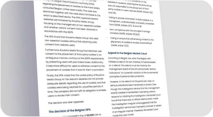 Roularta Media Group fined for unlawful use of cookies Summary Roularta Media Group, a Belgian media company, was • Due to the publication of a disclaimer on the among the subjects of a broad investigation carried websites in question, claiming that Roularta Group out by the Belgian Data Protection Authority (DPA) was not responsible for the placement of third- regarding the placement of cookies on the most widely party cookies on users’ devices (GDPR, Articles 5(2) consulted Belgian online news media. The case was and 24). examined together with the case about SA Rossel & Cie, • Failing to provide information to data subjects in a which is described above. The DPA inspected several transparent, understandable, and easily accessible websites administered by Roularta Media Group, form (GDPR, Articles 12(1), 13, and 14). focusing on the management of non-essential cookies • Non-compliance with the principle of storage and whether visitors’ consent had been obtained in limitation (GDPR, Articles 5(1)(e)). accordance with the GDPR. The DPA found that Roularta Media Group had used • Failing to ensure that withdrawing consent to the non-essential cookies without first obtaining valid placement of cookies is as easy as providing it consent from website users. (GDPR, Article 7(3)). Furthermore, Roularta Media Group had obtained user Appeal to the Belgian Market Court consent to the placement of third-party cookies in an ambiguous manner, contrary to the GDPR requirements, According to Belgian law, when the Belgian DPA by presenting users with pre-ticked boxes. Additionally, initiates a case on its own initiative, it must be based it was more difficult for users to withdraw consent to the on a referral. The referral must be made by the placement of cookies than it was for them to provide it. management board of the DPA and provide ”serious Finally, the DPA noted that the cookie policy of Roularta indications” of a potential violation of the fundamental Media Group on the relevant websites did not provide principles of personal data protection. adequate details regarding the use of cookies, and that However, in the referral for this particular case, no cookies were being retained for unjustified periods of serious indications were mentioned or proven. Even time. The company did not fulfill its obligation to enable though the investigation service (not the management users to revoke their consent. board) created a handwritten note listing various reasons for initiating the investigation, the Market Court The decision was later appealed. found that there was no official referral which made the investigation irregular and suggested that the The decision of the Belgian DPA investigation service was improperly involved or seized The Belgian DPA imposed a fine of 50,000 EUR on in an irregular manner. Therefore, the Market Court Roularta Media Group for the following violations: made the case invalid. • Placing non-essential cookies before obtaining user Decision of the Belgian Market Court consent, including cookies placed by third parties The Court invalidated the decision by the Belgian DPA, (GDPR, Article 6(1)(a) and Article 129(2)) of the as the referral on which the investigation was based Belgian Electronic Communications Act). was insufficient. • Non-compliance with the conditions for obtaining valid consent from users, namely by presenting users with pre-checked boxes on two websites, with partner companies’ cookies marked as ‘active’ by default (GDPR, Articles 4(11), 6(1)(a) and 7(1)). Published: 22-02-2023 Journal number: 2022/AR/953 Tags: 01 Legal basis and principles of processing 81