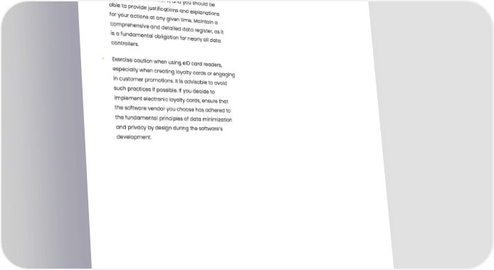 • Regardless of what legal basis you use, document your decisions and choices. Accountability is a key aspect of the GDPR, and you should be able to provide justifications and explanations for your actions at any given time. Maintain a comprehensive and detailed data register, as it is a fundamental obligation for nearly all data controllers. • Exercise caution when using eID card readers, especially when creating loyalty cards or engaging in customer promotions. It is advisable to avoid such practices if possible. If you decide to implement electronic loyalty cards, ensure that the software vendor you choose has adhered to the fundamental principles of data minimization and privacy by design during the software’s development. 95