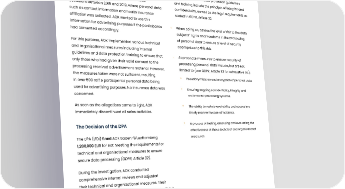 AOK Baden-Württemberg fined for failing to security of processing Summary Our remarks The health insurance company AOK Baden- • Ensure that internal data protection guidelines Württemberg hosted competitions on various and training include the principle of integrity and occasions between 2015 and 2019, where personal data confidentiality, as well as the legal requirements as such as contact information and health insurance stated in GDPR, Article 32. affiliation was collected. AOK wanted to use this information for advertising purposes if the participants • When doing so, assess the level of risk to the data had consented accordingly. subjects’ rights and freedoms in the processing For this purpose, AOK implemented various technical of personal data to ensure a level of security and organizational measures including internal appropriate to this risk. guidelines and data protection training to ensure that • Appropriate measures to ensure security of only those who had given their valid consent to the processing personal data include, but are not processing received advertisement material. However, limited to (see GDPR, Article 32 for exhaustive list): the measures taken were not sufficient, resulting ° Pseudonymization and encryption of personal data. in over 500 raffle participants’ personal data being used for advertising purposes. No insurance data was ° Ensuring ongoing confidentiality, integrity and concerned. resilience of processing systems. As soon as the allegations came to light, AOK ° The ability to restore availability and access in a immediately discontinued all sales activities. timely manner in case of incidents. The Decision of the DPA ° A process of testing, assessing and evaluating the effectiveness of these technical and organizational The DPA (LfDI) fined AOK Baden-Wuerttemberg measures. 1,200,000 EUR for not meeting the requirements for technical and organizational measures to ensure secure data processing (GDPR, Article 32). During the investigation, AOK conducted comprehensive internal reviews and adjusted their technical and organizational measures. Their cooperation with the DPA also resulted in a reduction in the amount of the fine. Published: 03-03-2022 Journal number: n/a Published: 30-06-20 Journal number: N/A Tags: 05 Data Security 47 Tags: 01 Legal Basis and principles of processing, 02 right to access and obligation to provide information