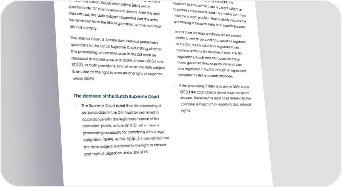 Legal basis for registration in Credit System Summary Our remarks A data subject took out a loan with Hoist Finance which • Before using Article 6(1)(c) of the GDPR, it is was registered in the Central Credit Information System essential to ensure that there is a legal obligation (CKI) of the Credit Registration Office (BKR) with a to process the personal data. This means that there special code ”A” due to payment arrears. After the debt must be a legal provision that explicitly requires the was settled, the data subject requested that the entry processing of personal data for a specific purpose. be removed from the BKR registration, but the controller did not comply. • In this case the legal provisions did not provide clarity on which personal data could be registered The District Court of Amsterdam referred preliminary in the CKI, the conditions for registration, and questions to the Dutch Supreme Court, asking whether the time limits for the deletion of data. The CKI the processing of personal data in the CKI must be regulations, which were not based on a legal assessed in accordance with GDPR, Articles 6(1)(c) and basis, governed these aspects. Personal data 6(1)(f), or both provisions, and whether the data subject was registered in the CKI through an agreement is entitled to the right to erasure and right of objection between the BKR and credit providers. under GDPR. • If the processing of data is based on GDPR, Article 6(1)(c) the data subjects do not have the right to The decision of the Dutch Supreme Court erasure. Therefore, the legal basis relied on by the • The Supreme Court ruled that the processing of controller is important in regards to data subjects’ personal data in the CKI must be examined in rights. accordance with the legitimate interest of the controller (GDPR, Article 6(1)(f)), rather than a processing necessary for complying with a legal obligation (GDPR, Article 6(1)(c)). It also stated that the data subject is entitled to the right to erasure and right of objection under the GDPR. Published: 03-12-2021 , Journal number: 21/00241 Tags: 01 Legal basis and principles of processing 30