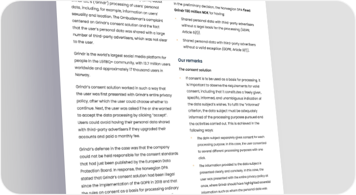Grindr preliminarily fined for 100 million NOK for consent solution Summary The decision of the Norwegian Data The Norwegian Consumer Ombudsman complained to Protection Authority the Norwegian Data Protection Authority (DPA) about In the preliminary decision, the Norwegian DPA fined Grindr LLC’s (’Grindr’) processing of users’ personal Grindr 100 million NOK for having: data, including, for example, information on users’ • Shared personal data with third-party advertisers sexuality and location. The Ombudsman’s complaint without a legal basis for the processing (GDPR, centered on Grindr’s consent solution and the fact Article 6(1)). that the user’s personal data was shared with a large number of third-party advertisers, which was not clear • Shared personal data with third-party advertisers to the user. without a valid exception (GDPR, Article 9(1)). Grindr is the world’s largest social media platform for Our remarks people in the LGTBQ+ community, with 13.7 million users The consent solution worldwide and approximately 17 thousand users in Norway. • If consent is to be used as a basis for processing, it Grindr’s consent solution worked in such a way that is important to observe the requirements for valid the user was first presented with Grindr’s entire privacy consent, including that it constitutes a freely given, policy, after which the user could choose whether to specific, informed, and unambiguous indication of continue. Next, the user was asked if he or she wanted the data subject’s wishes. To fulfill the ”informed” to accept the data processing by clicking ”accept”. criterion, the data subject must be adequately Users could avoid having their personal data shared informed of the processing purposes pursued and with third-party advertisers if they upgraded their the activities carried out. This is achieved in the accounts and paid a monthly fee. following ways: ° The data subject separately gives consent for each Grindr’s defense in the case was that the company processing purpose. In this case, the user consented could not be held responsible for the consent standards to several different processing purposes with one that had just been published by the European Data click. Protection Board. In response, the Norwegian DPA ° The information provided to the data subject is stated that Grindr’s consent solution had been illegal presented clearly and concisely. In this case, the since the implementation of the GDPR in 2018 and that user was presented with the entire privacy policy at the rules on consent as a basis for processing ordinary once, where Grindr should have highlighted essential personal data had not been substantially changed information such as whom the personal data was since the 1995 Data Protection Directive. shared with. The above resulted in a preliminary decision, to which ° The data subject must not be harmed by not giving Grindr could make their final submissions before the consent or by withdrawing consent. In this case, the Norwegian DPA issued a final decision. user could pay NOK 3,240 per year to use the app without the personal data being shared with third parties. According to the Norwegian DPA, this was enough for the data subject to suffer harm by not giving or withdrawing consent. Published: 24-01-2021, Journal number: 20/02136-5 Tags: 01 Basis for processing and principles of processing 135