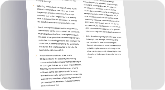 Our remarks • The Court concluded that GDPR, Article 82(1) must • The Court stated that the subjective feeling of be interpreted as including compensation for non- being infringed is not sufficient to award damages material damage. under GDPR, Article 82(1). Instead, it requires that • Collecting personal data on approximately 20,000 the unlawful act under data protection law has citizens in a single Excel sheet does not violate caused damage or imminent risk of damage to, for the principle of data minimization. Therefore, a example, reputation, loss of confidentiality, etc., or controller may collect large amounts of personal other consequences of a certain qualified nature. data in individual files if it is necessary to process Specifically, in this case, one of the citizens had DKK the data in the same document to fulfill a task. 95,000 stolen from his bank account. This loss was compensated, but the citizen’s fear of future misuse • Even if an employee breaches internal guidelines, of his information was not damage of a ”qualified” the controller can be accountable if the controller is nature according to the District Court’s assessment. aware that the unlawful act is being carried out. In • At the time of writing, this judgment is under appeal this case, employees of Gladsaxe Municipality were to the High Court. The legal position regarding prohibited from storing personal data locally on the compensation for non-material damage in computers, but at the same time, the municipality Denmark is therefore not carved in stone and can was aware that employees had to store the file probably only be considered definitively clarified locally to be able to work in it. when a similar judgment is delivered by the Court • The district court held that GDPR, Article of Justice of the European Union or the Supreme 82(1) provides for the possibility of awarding Court. compensation/indemnification to the data subject for damages that are not of a non-material nature. This may increase the disadvantages of being criticized, as the data controller will risk being faced with claims for compensation from the data subjects who have been affected by the unlawful processing, even if the Data Protection Authority does not issue a fine. 113