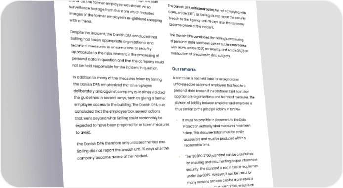 Unauthorized access to video surveillance Summary The Danish Data Protection Agency’s An employee in Salling (Danish supermarket) allowed decision a former employee to enter the store through the staff The Danish DPA criticized Salling for not complying with entrance. The former employee was shown video GDPR, Article 33(1), as Salling did not report the security surveillance footage from the store, which included breach to the Agency until 10 days after the company images of the former employee’s ex-girlfriend shopping became aware of the incident. with a friend. Despite the incident, the Danish DPA concluded that The Danish DPA concluded that Salling’s processing Salling had taken appropriate organizational and of personal data had been carried out in accordance technical measures to ensure a level of security with GDPR, Article 32(1) on security, and Article 34(1) on appropriate to the risks inherent in the processing of notification of breaches to data subjects. personal data in question and that the company could not be held responsible for the incident in question. Our remarks In addition to many of the measures taken by Salling, A controller is not held liable for exceptional or the Danish DPA emphasized that an employee unforeseeable actions of employees that lead to a deliberately and against company guidelines violated personal data breach if the controller itself has taken the guidelines in several ways, such as giving a former appropriate organizational and technical measures. The employee access to the building. The Danish DPA also division of liability between employer and employee is concluded that the employee took several actions thus similar to the principal liability in tort law. that went beyond what Salling could reasonably be • It must be possible to document to the Data expected to have been prepared for or taken measures Protection Authority what measures have been to avoid. taken. This documentation must be easily The Danish DPA therefore only criticized the fact that accessible and must be produced within a Salling did not report the breach until 10 days after the reasonable time. company became aware of the incident. • The ISO/IEC 27001 standard can be a useful tool for ensuring and documenting proper information security. The standard is not in itself a requirement under the GDPR. However, it can be useful for many reasons and can also be a prerequisite for compliance with ISO/IEC 27701, which is an extension to ISO/IEC 27001 and ISO/IEC 27002 for privacy protection and can be used to ensure compliance with the GDPR. Published: 18-06-2020, Journal number: 2020-441-4652 Tags: 05 Data security 109