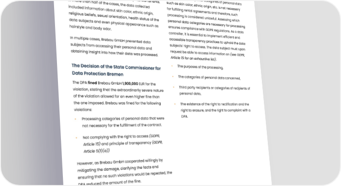 Brebau GmbH fined for for lack of legal basis and transparency Summary Our remarks The housing and residential association Brebau GmbH The processing of special categories of personal data processed sensitive data of over 9500 potential tenants. such as skin color, ethnic origin, etc. is not necessary In more than half of the cases, the data collected for fulfilling rental agreements and therefore, such included information about skin color, ethnic origin, processing is considered unlawful. Assessing which religious beliefs, sexual orientation, health status of the personal data categories are necessary for processing data subjects and even physical appearance such as ensures compliance with GDPR regulations. As a data hairstyle and body odor. controller, it is essential to implement efficient and accessible transparency practices to uphold the data In multiple cases, Brebau GmbH prevented data subjects’ right to access. The data subject must upon subjects from accessing their personal data and request be able to access information on (see GDPR, obtaining insight into how their data was processed. Article 15 for an exhaustive list): The Decision of the State Commissioner for • The purposes of the processing, Data Protection Bremen • The categories of personal data concerned, The DPA fined Brebau GmbH 1,900,000 EUR for the • Third party recipients or categories of recipients of violation, stating that the extraordinarily severe nature personal data, of the violation allowed for an even higher fine than the one imposed. Brebau was fined for the following • The existence of the right to rectification and the violations: right to erasure, and the right to complaint with a • Processing categories of personal data that were DPA. not necessary for the fulfillment of the contract. • Not complying with the right to access (GDPR, Article 15) and principle of transparency (GDPR, Article 5(1)(a)) However, as Brebau GmbH cooperated willingly by mitigating the damage, clarifying the facts and ensuring that no such violations would be repeated, the DPA reduced the amount of the fine. Published: 03-03-2022 Journal number: n/a 46 Tags: 01 Legal Basis and principles of processing, 02 right to access and obligation to provide information