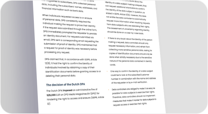 DPG Media fined for unnecessary ID requests Summary Our remarks DPG produced magazines that subscribers could • When data controllers are unsure about the receive by taking out a subscription. In order to send identity of a data subject making a request, they the magazines to subscribers, DPG collected personal can request additional information to confirm data, including the subscribers’ names, addresses, and the identity of the data subject in question, as financial information such as bank data. stated in GDPR, Article 12(6). However, this does not entitle the data controller to automatically When individuals requested access to or erasure request more information when receiving requests of personal data, DPG consistently required the from data subjects who are exercising their rights. individual making the request to prove their identity. The assessment of uncertainty regarding identity If the request was submitted through the online form, should be done on a case-by-case basis. DPG immediately prompted the requester to provide an identity document. For requests submitted via • If there is any doubt about the identity of the person email, DPG sent a corresponding email requesting the making a request, data controllers should only submission of proof of identity. DPG maintained that request necessary information, and refrain from a request for proof of identity was necessary before collecting more sensitive personal data. Asking for processing any request. copies of identification documents should only be done when strictly necessary due to the sensitive DPG claimed that, in accordance with GDPR, Article nature of the personal data contained in identity 12(6), it had the right to confirm the identity of cards. individuals involved by obtaining a copy of their identification documents before granting access to or • One way to confirm the identity of a data subject deleting their personal data. could be to look at the subscriber/customer number in combination with the name and address The decision of the Dutch DPA of the requester or by e-mail verification. The Dutch DPA imposed an administrative fine of • Data controllers are obliged to make it as easy as 525,000 EUR on DPG Media Magazines BV (DPG) for possible for data subjects to exercise their rights. hindering the right to access and erasure (GDPR, Article Therefore, data controllers should not implement 12). measures that make it harder for data subjects to request access or exercise their rights. Published: 14-01-2022, Journal number: N/A Tags: 03 Right to erasure and rectification 24