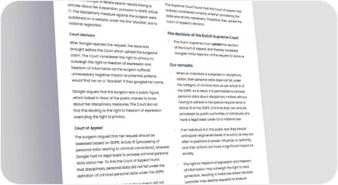 Surgeon sued Google for linking to articles about her Summary A plastic surgeon who had been conditionally Supreme Court suspended in 2016 for a lack of patient aftercare The Supreme Court found that the Court of Appeal had requested Google to delete search results linking to already considered correctly whether processing the articles about her suspension, pursuant to GDPR, Article data was strictly necessary. Therefore, they upheld the 17. The disciplinary measure against the surgeon were Court of Appeal’s decision. published on a website under the title ‘blacklist’ due to national legislation. The decision of the Dutch Supreme Court Court decision • The Dutch Supreme Court upheld the decision After Google rejected the request, the issue was of the Court of Appeal, and thereby accepted brought before the Court which upheld the surgeons’ Googles’ initial rejection of the request for erasure. claim. The Court considered the right to privacy to outweigh the right to freedom of expression and Our remarks freedom of information as the surgeon suffered • When an individual is subjected to disciplinary unnecessary negative impact as potential patients action, their personal data does not fall under would find her on a “blacklist” if they googled her name. the category of criminal data as per Article 10 of Google argued that the surgeon was a public figure, the GDPR. As a result, it is permissible to process which talked in favor of the public interest to know personal data about disciplinary matters without about her disciplinary measures. The Court did not having to adhere to the special requirements of find this leading to the right to freedom of expression Article 10 of the GDPR. Criminal data can only be overruling the right to privacy. processed by public authorities or individuals who have a legal basis under EU or national law. Court of Appeal • If an individual is in the public eye, they should The surgeon argued that her request should be anticipate heightened levels of scrutiny as they are assessed based on GDPR, Article 10 (processing of often in positions of power, influence, or authority, personal data relating to criminal convictions), whereas and their actions can have a significant impact on Google had no legal basis to process criminal personal society. data about her. To this the Court of Appeal found that disciplinary personal data did not fall under the • The right to freedom of expression and freedom definition of criminal personal data under the GDPR. of information may outweigh the right to data protection, resulting in instances where the data The Court of Appeal found that the surgeon did not controller may decline requests for erasure. provide sufficient evidence that she was substantially hindered by the contested search results. The Court considered that the applicant is a public figure in a debate on a subject regarding her profession, and that her controversial treatments and products require easily accessible online information for patients. The Court’s decision was based on the public’s interest to access information, and that outweighed the applicant’s right to privacy in this case. Published: 03-12-2021 , Journal number: 21/00241 Tags: 01 Legal basis and principles of processing Published: 25-02-2022, Journal number: 20/02950 Tags: 03 Right to erasure and rectification 31