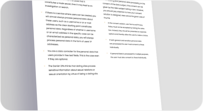 Our remarks • If you refuse to provide information about • When basing your personal data processing on the processing to the DPA on the basis that it consent of the data subject, this consent can be constitutes a trade secret, then it may lead to an given by the data subject ticking a box. However, investigation or search. you should pay attention to how your consent solution is designed. Here are some good rules of • If there is a service where users can be created, you thumb: will almost always process personal data about these users, such as a username or an e-mail ° In the consent solution, user Terms and Privacy address as the clear starting point constitutes Policy must not be accepted by ticking the same personal data. Regardless of whether a username box. Instead, they should be presented as separate or an email address in the specific case can be options and thereby allow the user to make a choice. characterized as personal data, you will always ° If both general and sensitive personal data process personal data in the form of users’ IP are processed, the user must consent to these addresses. individually. • You are a data controller for the personal data that ° If personal data is processed for multiple purposes, users provide in free text fields. This is the case even the user must also consent to these individually. if they are optional. • The Danish DPA thinks that dating sites process sensitive information about sexual relations or sexual orientation by virtue of being a dating site. 107