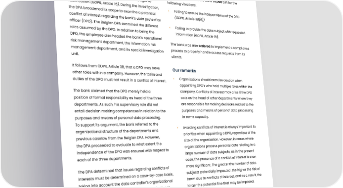 Bank fined due to a conflict of interest regarding its DPO Summary Decision of the Belgian DPA An individual filed a complaint with the Belgian The Belgian DPA fined the bank 75,000 EUR for the DPA, claiming that a bank had violated his right to following violations: rectification (GDPR, Article 16). During the investigation, • Failing to ensure the independence of the DPO the DPA broadened its scope to examine a potential (GDPR, Article 38(6)). conflict of interest regarding the bank’s data protection officer (DPO). The Belgian DPA examined the different • Failing to provide the data subject with requested roles assumed by the DPO. In addition to being the information (GDPR, Article 15). DPO, the employee also headed the bank’s operational risk management department, the information risk The bank was also ordered to implement a compliance management department, and its special investigation process to properly handle access requests from its unit. clients. It follows from GDPR, Article 38, that a DPO may have Our remarks other roles within a company. However, the tasks and • Organizations should exercise caution when duties of the DPO must not result in a conflict of interest. appointing DPO’s who hold multiple roles within the The bank claimed that the DPO merely held a company. Conflicts of interest may arise if the DPO position of formal responsibility as head of the three acts as the head of other departments where they departments. As such, his supervisory role did not are responsible for making decisions related to the entail decision making competences in relation to the purposes and means of personal data processing purposes and means of personal data processing. in some capacity. To support its argument, the bank referred to the • Avoiding conflicts of interest is always important to organizational structure of the departments and prioritize when appointing a DPO, regardless of the previous caselaw from the Belgian DPA. However, size of the organization. However, in cases where the DPA proceeded to evaluate to what extent the organizations process personal data relating to a independence of the DPO was ensured with respect to large number of data subjects, as in the present each of the three departments. case, the presence of a conflict of interest is even The DPA determined that issues regarding conflicts of more significant. The greater the number of data interests must be determined on a case-by-case basis, subjects potentially impacted, the higher the risk of taking into account the data controller’s organizational harm due to conflicts of interest, and as a result, the structure. The DPA then found that the organizational larger the potential fine that may be imposed. structure of the bank de facto resulted in the DPO having responsibilities and performing tasks as head of the three departments that were incompatible with his role as DPO. Published: 16-12-2021 Journal number: DOS-2020-03763 Tags: 01 Legal basis and principles of processing 78