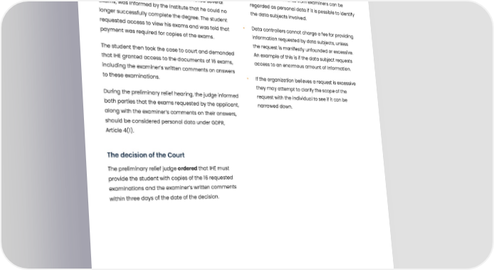 Does the right to access also extend to exams and comments? Summary Our remarks A student who had studied at The IHE Delft Institute for • Exams and comments from examiners can be Water Education from 2011 to 2013, and failed several regarded as personal data if it is possible to identify exams, was informed by the institute that he could no the data subjects involved. longer successfully complete the degree. The student requested access to view his exams and was told that • Data controllers cannot charge a fee for providing payment was required for copies of the exams. information requested by data subjects, unless the request is manifestly unfounded or excessive. The student then took the case to court and demanded An example of this is if the data subject requests that IHE granted access to the documents of 16 exams, access to an enormous amount of information. including the examiner’s written comments on answers to these examinations. • If the organization believes a request is excessive they may attempt to clarify the scope of the During the preliminary relief hearing, the judge informed request with the individual to see if it can be both parties that the exams requested by the applicant, narrowed down. along with the examiner’s comments on their answers, should be considered personal data under GDPR, Article 4(1). The decision of the Court The preliminary relief judge ordered that IHE must provide the student with copies of the 16 requested examinations and the examiner’s written comments within three days of the date of the decision. Published: 27-07-2021, Journal number: 200.290.520_01 Tags: 02 Right of access and obligation to provide information Published: 28-05-2019, Journal number: C/09/564550 / HARK 18-596 Tags: 02 Right of access and obligation to provide information 35