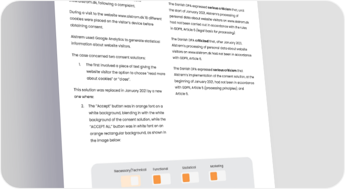 Serious criticism for processing personal data about website visitors Summary The Danish Data Protection Agency’s The case originated from the Danish DPA’s decision on decision January 28, 2021, to investigate the website The Danish DPA expressed serious criticism that, until www.alstrom.dk, following a complaint. the start of January 2021, Alstrøm’s processing of During a visit to the website www.alstrom.dk 18 different personal data about website visitors on www.alstrom.dk cookies were placed on the visitor’s device before had not been carried out in accordance with the rules obtaining consent. in GDPR, Article 6 (legal basis for processing). Alstrøm used Google Analytics to generate statistical The Danish DPA criticized that, after January 2021, information about website visitors. Alstrøm’s processing of personal data about website visitors on www.alstrom.dk had not been in accordance The case concerned two consent solutions: with GDPR, Article 6. 1. The first involved a piece of text giving the The Danish DPA expressed serious criticism that website visitor the option to choose ”read more Alstrøm’s implementation of the consent solution, at the about cookies” or ”close”. beginning of January 2021, had not been in accordance This solution was replaced in January 2021 by a new with GDPR, Article 5 (processing principles), and one where: Article 6. 2. The ”Accept” button was in orange font on a white background, blending in with the white background of the consent solution, while the ”ACCEPT ALL” button was in white font on an orange rectangular background, as shown in the image below: Necessary/Technical Functional Statistical Marketing ACCEPT ACCEPT ALL SHOW COOKIEDETAILS Published: 20-10-2021, Journal number: 2021-431-0125 Tags: 01 Legal basis for processing and principles for processing 104