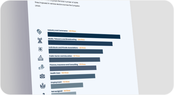 Number of fines across different sectors in the EU The graph below displays the total number of GDPR fines imposed in various sectors across the European Union. Industry and Commerce - 280 fines Media, Telecoms and Broadcasting - 244 fines Individuals and Private Associations - 201 fines Public Sector and Education - 187 fines Finance, Insurance and Consulting - 170 fines Health Care - 163 fines Employment - 113 fines Not assigned - 86 fines ? Transportation and Energy - 82 fines Accomodation and Hospitality - 56 fines Real Estate - 52 fines 9
