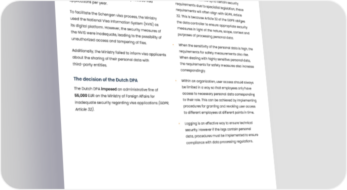 Foreign office fined for poor security Summary Our remarks Over the last three years, The Dutch Ministry of Foreign • If a controller must live up to certain security Affairs has processed approximately 530,000 visa requirements due to specialist legislation, these applications per year. requirements will often align with GDPR, Article 32. This is because Article 32 of the GDPR obliges To facilitate the Schengen visa process, the Ministry the data controller to ensure appropriate security used the National Visa Information System (NVIS) as measures in light of the nature, scope, context and its digital platform. However, the security measures of purposes of processing personal data. the NVIS were inadequate, leading to the possibility of unauthorized access and tampering of files. • When the sensitivity of the personal data is high, the requirements for safety measurements also rise. Additionally, the Ministry failed to inform visa applicants When dealing with highly sensitive personal data, about the sharing of their personal data with the requirements for safety measures also increase third-party entities. correspondingly. The decision of the Dutch DPA • Within an organization, user access should always The Dutch DPA imposed an administrative fine of be limited in a way so that employees only have 55,000 EUR on the Ministry of Foreign Affairs for access to necessary personal data corresponding inadequate security regarding visa applications (GDPR, to their role. This can be achieved by implementing Article 32). procedures for granting and revoking user access to different employees at different points in time. • Logging is an effective way to ensure technical security. However if the logs contain personal data, procedures must be implemented to ensure compliance with data processing regulations. Published: 29-04-2021, Journal number: N/A Tags: 01 Legal basis and principles of processing Published: 06-04-2022, Journal number: N/A Tags: 05 Data security 23