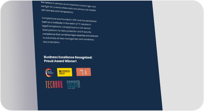 About ComplyCloud ComplyCloud is on a mission to empower businesses to achieve seamless compliance and build unwavering trust with simplified data protection and IT security. We believe in privacy as an important human right, and we fight for a world where data and privacy are treated with fairness and transparency. ComplyCloud was founded in 2017 and has established itself as a trailblazer in the realm of ”IT-solution in legal/compliance. ComplyCloud is a full-service SaaS platform for data protection and IT security compliance that combines legal expertise and software to automate all task management and mandatory documentation. Business Excellence Recognized: Proud Award Winner! ComplyCloud ApS CVR: 35813764 Borgergade 24B, 3.-4. sal 1300 København K Danmark www.complycloud.com 147
