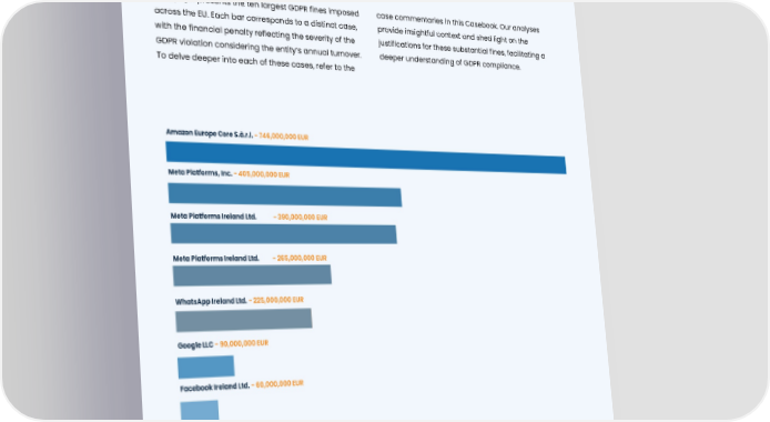Ten highest fines Top ten GDPR fines in the EU This graph presents the ten largest GDPR fines imposed case commentaries in this Casebook. Our analyses across the EU. Each bar corresponds to a distinct case, provide insightful context and shed light on the with the financial penalty reflecting the severity of the justifications for these substantial fines, facilitating a GDPR violation considering the entity’s annual turnover. deeper understanding of GDPR compliance. To delve deeper into each of these cases, refer to the Amazon Europe Core S.à.r.l. - 746,000,000 EUR Meta Platforms, Inc. - 405,000,000 EUR Meta Platforms Ireland Ltd. - 390,000,000 EUR Meta Platforms Ireland Ltd. - 265,000,000 EUR WhatsApp Ireland Ltd.- 225,000,000 EUR Google LLC - 90,000,000 EUR Facebook Ireland Ltd.- 60,000,000 EUR Google Ireland Ltd.- 60,000,000 EUR Google LLC - 50,000,000 EUR H&M Hennes & Mauritz Online Shop A.B. & Co. KG - 35,258,708 EUR 14