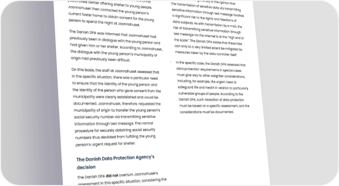 Transmitting sensitive information through text message Summary Our remarks During the evening of 2nd September 2021, a young • The Danish DPA is generally of the opinion that person approached Joannahuset, which is a child/ the transmission of sensitive data via transmitting youth crisis center offering shelter to young people. sensitive information through text message involves Joannahuset then contacted the young person’s a significant risk to the rights and freedoms of current foster home to obtain consent for the young data subjects. As with transmission by e-mail, the person to spend the night at Joannahuset. risk of transmitting sensitive information through text message via the Internet is at the ”high end of The Danish DPA was informed that Joannahuset had the scale”. The Danish DPA states that these risks previously been in dialogue with the young person and can only to a very limited extent be mitigated by had given him or her shelter. According to Joannahuset, measures taken by the data controller itself. the dialogue with the young person’s municipality of origin had previously been difficult. • In the specific case, the Danish DPA assessed that data protection requirements in special cases On this basis, the staff at Joannahuset assessed that must give way to other weightier considerations, in the specific situation, there was a particular need including, for example, the urgent need to to ensure that the identity of the young person and safeguard life and health in relation to particularly the identity of the person who gave consent from the vulnerable groups of people. According to the municipality were clearly established and could be Danish DPA, such relaxation of data protection documented. Joannahuset, therefore, requested the must be based on a specific assessment, and the municipality of origin to transfer the young person’s considerations must be documented. social security number via transmitting sensitive information through text message. The normal procedure for securely obtaining social security numbers thus deviated from fulfilling the young person’s urgent request for shelter. The Danish Data Protection Agency’s decision The Danish DPA did not overturn Joannahuset’s assessment in this specific situation, considering the young person’s best interests, arising in an acute situation and with limited possible solutions. This outweighed the consideration of the protection of personal data since the young person could have suffered a greater loss of rights if the transmitting sensitive information through text message in question had not been sent. Published: 27-04-2022 Journal number: 2021-431-0151 Tags: 05 Data security 114