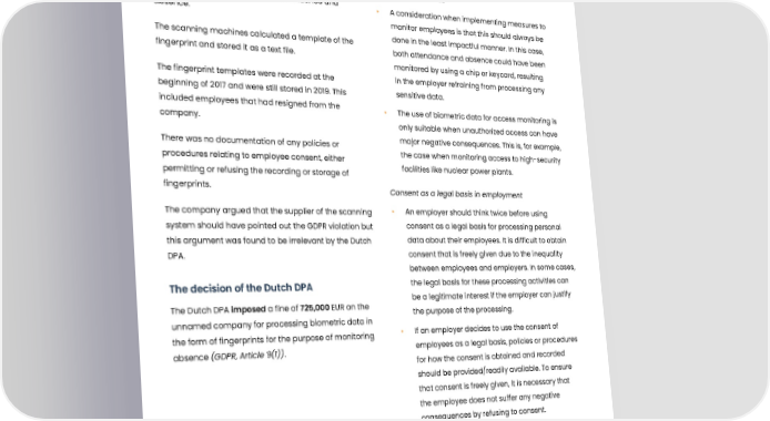 Company fined for processing employees’ fingerprint data Summary Our remarks An unnamed company scanned the fingerprints Monitoring measures of employees in order to monitor attendance and • A consideration when implementing measures to absence. monitor employees is that this should always be The scanning machines calculated a template of the done in the least impactful manner. In this case, fingerprint and stored it as a text file. both attendance and absence could have been monitored by using a chip or keycard, resulting The fingerprint templates were recorded at the in the employer refraining from processing any beginning of 2017 and were still stored in 2019. This sensitive data. included employees that had resigned from the • The use of biometric data for access monitoring is company. only suitable when unauthorized access can have There was no documentation of any policies or major negative consequences. This is, for example, procedures relating to employee consent, either the case when monitoring access to high-security permitting or refusing the recording or storage of facilities like nuclear power plants. fingerprints. Consent as a legal basis in employment The company argued that the supplier of the scanning • An employer should think twice before using system should have pointed out the GDPR violation but consent as a legal basis for processing personal this argument was found to be irrelevant by the Dutch data about their employees. It is difficult to obtain DPA. consent that is freely given due to the inequality between employees and employers. In some cases, The decision of the Dutch DPA the legal basis for these processing activities can The Dutch DPA imposed a fine of 725,000 EUR on the be a legitimate interest if the employer can justify unnamed company for processing biometric data in the purpose of the processing. the form of fingerprints for the purpose of monitoring • If an employer decides to use the consent of absence (GDPR, Article 9(1)). employees as a legal basis, policies or procedures for how the consent is obtained and recorded should be provided/readily available. To ensure that consent is freely given, it is necessary that the employee does not suffer any negative consequences by refusing to consent. Accountability • A data controller cannot put the responsibility on suppliers when it comes to the choice of measure to achieve a purpose. It will always be the data controller’s responsibility to ensure compliance with the services they use. Published: 09-04-2021 Journal number: N/A Tags: 02 Right of access and obligation to provide information Published: 30-04-2020, Journal number: N/A Tags: 01 Legal basis and principles of processing 21