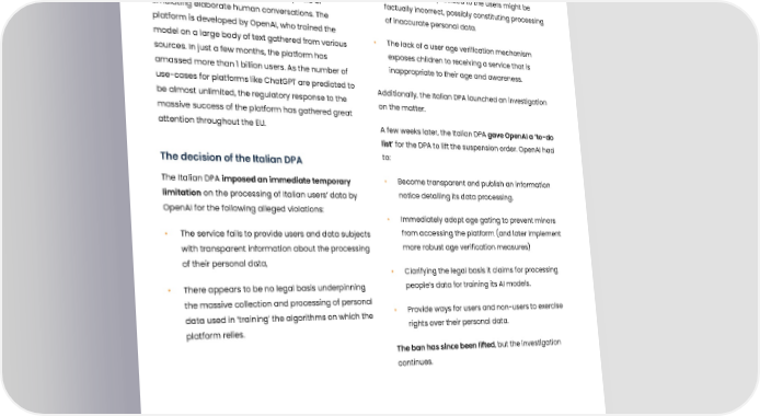 Italian DPA bans Chat GPT Summary ChatGPT is the best known among relational Artificial • The information provided to the users might be Intelligence (AI) platforms that are capable of factually incorrect, possibly constituting processing emulating elaborate human conversations. The of inaccurate personal data. platform is developed by OpenAI, who trained the • The lack of a user age verification mechanism model on a large body of text gathered from various exposes children to receiving a service that is sources. In just a few months, the platform has inappropriate to their age and awareness. amassed more than 1 billion users. As the number of use-cases for platforms like ChatGPT are predicted to Additionally, the Italian DPA launched an investigation be almost unlimited, the regulatory response to the on the matter. massive success of the platform has gathered great attention throughout the EU. A few weeks later, the Italian DPA gave OpenAI a ‘to-do list’ for the DPA to lift the suspension order. OpenAI had The decision of the Italian DPA to: The Italian DPA imposed an immediate temporary • Become transparent and publish an information limitation on the processing of Italian users’ data by notice detailing its data processing. OpenAI for the following alleged violations: • Immediately adopt age gating to prevent minors • The service fails to provide users and data subjects from accessing the platform (and later implement with transparent information about the processing more robust age verification measures) of their personal data, • Clarifying the legal basis it claims for processing • There appears to be no legal basis underpinning people’s data for training its AI models. the massive collection and processing of personal • Provide ways for users and non-users to exercise data used in ‘training’ the algorithms on which the rights over their personal data. platform relies. The ban has since been lifted, but the investigation continues. Published: 30-03-23, Journal number: N/A Tags: Legal basis for processing and principles of processing 140