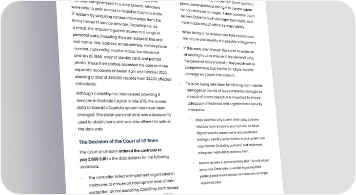 Scalable Capital ordered to compensate data subject for non-material damages Summary Our remarks Upon registration as a customer at Scalable Capital, • The case signifies that the German Court applies a individuals provided a range of personal data that broad interpretation of the right to compensation was later compromised in a data breach. Attackers for non-material damages. A data controller could were able to gain access to Scalable Capital’s entire be held liable for such damages that might result IT system by acquiring access information from the from a data breach within its responsibility. firm’s former IT service provider, CodeShip Inc. As • When doing a risk assessment, take into account a result, the attackers gained access to a range of the nature and severity of a possible infringement. personal data, including the data subjects’ first and last name, title, address, email address, mobile phone • In this case, even though there was no evidence number, nationality, marital status, tax residence of existing fraud or misuse of the personal data, and tax ID, IBAN, copy of identity card, and portrait the personal data involved in the breach was so photo. These third parties accessed the data on three comprehensive that the risk for future material separate occasions between April and October 2020, damage was taken into account. stealing a total of 389,000 records from 33,200 affected • To avoid being held liable for inflicting non-material individuals. damages or the risk of future material damages as Although CodeShip Inc. had ceased providing IT a result of a data breach, it is important to ensure services to Scalable Capital in late 2015, the access adequacy of technical and organizational security data to Scalable Capital’s system had never been measures: changed. The stolen personal data was subsequently used to obtain loans and was also offered for sale on ° Make sure that only current third-party business the dark web. relations have access to your systems. Conduct regular security assessments and penetration The Decision of the Court of LG Bonn testing to identify vulnerabilities in your system and The Court of LG Bonn ordered the controller to organization (including partners) and implement pay 2,500 EUR to the data subject for the following adequate measures to address them. violations: ° Monitor access to personal data, limit it to authorized • The controller failed to implement organizational personnel (internally as well as regarding third measures to ensure an appropriate level of data parties), and revoke access for those who no longer protection by not excluding CodeShip from access require access. to their digital document archives immediately after the termination of their business relationship (GPDR, Articles 31(1) and 5(1)(f)). • The Court found that the data breach had caused non-material damage to the affected individuals, such as feelings of uncertainty, loss of trust, and anxiety about potential misuse of their personal data. Therefore, the Court ordered compensation for non-material damage (GDPR, Article 82(1)). Published: 09-12-2021 Journal number: 31 O 16606/20 Tags: 05 Data Security, 08 Compensation for non-material damages 56