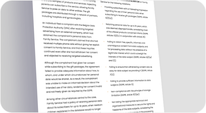 Family Service fined for unlawful consent practices Summary Decision of the Belgian DPA Family Service is an advertisement agency, offering so- The Belgian DPA imposed a fine of 50,000 EUR on Family called ‘gift packages’ for expecting parents, containing Service for the following violations: offers and samples of products and services. Expecting • Providing subscribers with a misleading impression parents can subscribe to the service, allowing Family regarding the use of their personal data when Service to pass on data to other entities. The gift subscribing to receive gift packages (GDPR, Article packages are distributed through a network of partners, 5(1)(a)). including hospitals and gynecologists. An individual filed a complaint with the Belgian Data • Retaining personal data for up to 18 years, which Protection Authority (DPA) after receiving targeted was deemed disproportionate, considering most advertising from an external company, which had of the offered products concerned infants (GDPR, obtained the complainant’s personal data from Articles 5(1)(c) in conjunction with Article 25). Family Service. The complainant claimed that she had • Failing to obtain free, specific, informed, and received multiple phone calls without giving her explicit unambiguous consent from data subjects, and consent to Family Service, and that these inquiries for processing data without the presence of a continued even after she had withdrawn her consent legitimate interest which could outweigh the and objected to receiving targeted advertising. interests of the data subject (GDPR, Articles 6(1)(a) Although the complainant had given her consent and (f)). while subscribing to the gift packages, the agreement • Failing to ensure that withdrawing consent was as failed to provide adequate information about how, to easy for data subject as providing it (GDPR, Article whom, and under which circumstances her personal 7(3)). data would be shared. As a result, the complainant was unable to make an informed decision about the • Failing to provide sufficient information to data intended use of her data, rendering her consent invalid subjects (GDPR, Article 13). and not freely given as required by the GDPR. • Non-compliance with the principle of storage Among other circumstances central to the case, limitation (GDPR, Article 5(1)(e)). Family Service had a policy of retaining personal data • Not taking the appropriate technical and about its subscribers for up to 18 years, when newborn organizational measures to secure the rights and children registered in the database would no longer freedoms of the data subjects, considering the be legally represented by their parents. Furthermore, nature, context, and purpose of the processing no record was kept of requests for rectification. Finally, activities in question (GDPR, Article 24). subscribers’ email addresses were intentionally kept even after data subjects had requested erasure to • The lack of processing agreements between Family ensure that no new accounts were created using the Service and one of their data processors (GDPR, same email address later. According to the DPA, these Article 28(3)). activities were against both the letter and the spirit of the GDPR. Published: 27-01-2021 Journal number: DOS-2019-04798 Tags: 01 Legal basis and principles of processing 83