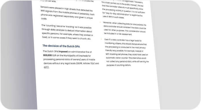 Municipality fined for missing legal basis for Wifi-tracking Summary Our remarks The municipality of Enschede used WiFi counting in the • If a processing relies on the legal basis “necessary city center with the aim of measuring how crowded the for a task carried out in the public interest”, the law city center was. that the controller refers to must specifically allow the processing activity in question. It is not sufficient Sensors were placed in high streets that detected the for ”day-to-day administration” to legitimize the WiFi signals from the mobile phones of passersby. Each use of WIFI in such cases. phone was registered separately and given a unique code. • Moreover, when collecting data for one purpose, the data controller should consider if the data could be The ‘counting’ became ‘tracking’ as it was possible used for other purposes. This consideration should through data analysis to deduct information about be included in a risk assessment. specific persons. For example, where they worked or lived, or in some cases if they went to church, etc. • Even if a data controller has a legal basis for monitoring citizens, this should always ensure that The decision of the Dutch DPA the processing is conducted in the most privacy- The Dutch DPA imposed an administrative fine of friendly way possible. For example, instead of 600,000 EUR on the Municipality of Enschede for WiFi-tracking cell phones, they could have used an processing personal data of owners/users of mobile automatic visitor counter. This alternative would devices without any legal basis (GDPR, Articles 5(a) and not collect any personal data, while still serving the 6(1)). purpose of counting visitors. Published: 29-04-2021, Journal number: N/A Tags: 01 Legal basis and principles of processing 22