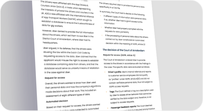 Uber, right to access and data portability Summary In 2018, a group of Uber drivers from the United Kingdom Right to data portability submitted requests to access their data to Uber. The drivers required Uber to provide the personal data The drivers were affiliated with the App Drivers & specifically in a CVS file. Couriers Union (ADCU), a trade union representing In summary, the Court had to decide on the following: the interests of private hire drivers and couriers in the • If different types of information were personal data. UK. ADCU was affiliated with the International Alliance If so, whether Uber had to grant access to this of App Transport Workers (IAATW), which sought to information establish a database to ensure the trustworthiness of data for gig workers. • Whether Uber had properly complied with the However, Uber denied to provide the full information requests for data portability about the drivers, which led them to sue Uber in the • If the processing of personal data about the drivers District Court of Amsterdam, where Uber had its carried out by Uber constituted an automated headquarters. decision within the meaning of GDPR, Article 22 Uber argued, in its defense, that the drivers were The decision of the Court of Amsterdam abusing the law within the Dutch Civil Code by Request for access (GDPR, Article 15) requesting access to the data. Uber claimed that the applicant would misuse the right to access to establish The Court of Amsterdam ordered Uber to provide a database containing data from drivers, and that the access to the drivers in accordance with the findings in database would serve as unlawful means of retaliation the case. The specific data were evaluated as follows: in the case against Uber. • Driver’s profile: Uber’s internal referrals and reports Request for access to customer service employees did not qualify as ”profiles” under GDPR, Article 4(4) and did not Overall, the drivers wanted to know how Uber used contain verifiable personal data, thus not subject to their personal data and how the company’s algorithms GDPR access requests. made decisions about their work. This included an • Tags: The Court defined a tag as a description used assessment of eight different types of data. by Uber to assess driver behavior that cannot be Automated decision verified by the data subject and, therefore, is not Based on their request for access, the drivers wanted subject to access requests. to establish that they were subjected to automated • Passenger feedback reports: The Court deemed decisions within the meaning of GDPR, Article 22, so that these as personal data but required anonymization they would be entitled to receive information about how to protect the rights of others under GDPR, Article the automated decision was made. 15(4), and Uber did not have to provide further Uber used automated data processing to allocate access to the passengers’ details based on the available rides through the “batch matching contractual relationship. system”. The system grouped the nearest drivers and • Start and end location of a trip: The Court found passengers in a batch and determined the optimal Uber’s overviews of journey times and locations match within that group between a driver and a sufficient for access requests, preventing potential passenger. privacy rights infringements. Published: 18-01-2022, Journal number: 200.297.497_01 Tags: 03 Right to erasure and rectificatio Published: 11-03-2021, Journal number: C/13/687315 / HARK 20-207 Tags: 02 Request for access and obligation to provide information 37