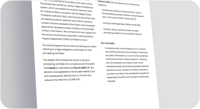 School fined for processing data about minors without parental consent Summary Final decision A Flemish educational institution introduced a well- A fine of 1,000 EUR was upheld due to the following being survey directed at its students who were minors. violations: The survey was carried out using a digital SmartSchool • Excessive processing of personal data in light of system, which processed the students’ personal data. the processing purpose, contrary to the principle of An individual filed a complaint with the Belgian Data data minimization (GDPR, Article 5(1)(c)). Protection Authority (DPA), claiming that the school was processing students’ personal data without parental • Lacking a valid legal basis (GDPR, Article 6(1)). consent and that excessive information was processed beyond the necessary scope, contrary to the principle • Failing to obtain parental consent for data of data minimization. The complainant also argued that processing related to minors (GDPR, Article 8). the school should have conducted a data protection impact assessment (DPIA) but failed to do so. Our remarks The school argued that the data processing was lawful, • Compliance with the principles set out in Article 5 referring to a legal obligation as the basis for their of the GDPR, particularly the principles of lawfulness processing activities. and data minimization, is crucial as they constitute The Belgian DPA ordered the school to bring its fundamental tenets of data protection. Collecting processing activities into compliance with the GDPR only the necessary and relevant data for the and issued an administrative fine of 2,000 EUR. The intended purpose and avoiding excessive retention decision was appealed to the Brussels Market Court periods is crucial. Violations of these fundamental and subsequently referred back to the DPA who provisions are likely to be considered as significant reduced the initial fine of 2,000 EUR. breaches by the DPA and may result in fines being imposed. Published: 06-10-2021 Journal number: AR/2021/576 Tags: 01 Legal basis and principles of processing 99