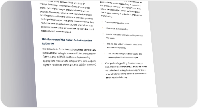 Deliveroo fined 2.5 million EUR for not informing about automated processing Summary Our remarks An Italian food delivery company, Deliveroo, used • Using AI technology to score an individual based on AI technology to manage their couriers’ ability to personal data constitutes profiling. To ensure that choose shifts. Shifts between 19:00 and 21:00 on the profiling is compliant with the GDPR, you must Fridays, Saturdays, and Sundays (called ’super peak’ inform the data subject clearly and in language shifts) paid higher wages and were therefore more that is clear and easy to understand, and includes popular. The courier with the best score had priority in the following: booking shifts. A bidder’s score was based on previous participation in super peak shifts, how many times they ° That the profiling is taking place. had canceled a booked session, and how quickly they ° What data is used for profiling. delivered orders. A bidder could see its score but could not see how it was calculated. ° How the technology behind the profiling calculates the results. The decision of the Italian Data Protection ° That the data subject is allowed to object to the Authority outcome of the profiling. The Italian Data Protection Authority fined Deliveroo 2.5 million EUR for failing to ensure sufficient transparency ° That the AI technology is only fed with the data (GDPR, Article 5(1)(a)), and for not implementing necessary to achieve the desired output. appropriate measures to safeguard the data subject’s • When performing profiling via AI technology, a rights in relation to profiling (Article 22(3) of the GDPR). data impact assessment should always be carried out beforehand, testing the technology for bias to ensure that the profiling arrives at a correct result and is not discriminatory. Published: 22-07-2021, Journal number: 9685994 Tags: 01 Legal basis for processing and principles of processing 138