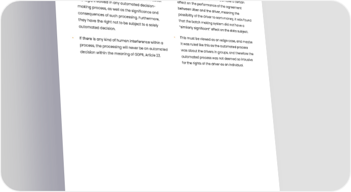 Automated decision-making • It is important for data subjects to know if they have • If an automated decision has no legal been subject to automated decision-making under consequence, it should be assessed if it has a GDPR, Article 22, because such decisions can have “similarly significant” effect. Even though the significant legal or other effects on individuals. “batched matching system” did have a certain Data subjects have the right to be informed about effect on the performance of the agreement the logic involved in any automated decision- between Uber and the driver, meaning the making process, as well as the significance and possibility of the driver to earn money, it was found consequences of such processing. Furthermore, that the batch making system did not have a they have the right not to be subject to a solely “similarly significant” effect on the data subject. automated decision. • This must be viewed as an edge case, and maybe • If there is any kind of human interference within a it was ruled like this as the automated process process, the processing will never be an automated was about the drivers in groups, and therefore the decision within the meaning of GDPR, Article 22. automated process was not deemed so intrusive for the rights of the driver as an individual. 39