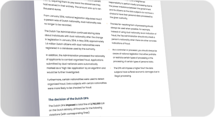 Tax administration fined for discriminatory processing Summary Our remarks Between 2013 and 2019, around 26,000 parents were • Governmental bodies have a heightened wrongly accused of making fraudulent childcare benefit responsibility to perform lawful processing due to claims, requiring them to pay back the allowances they the power imbalance between the government had received in their entirety. The amount was up to ten and its citizens as the data subjects do not have a thousand euros. choice to have their personal data processed by the given authority. From January 2014, national legislation stipulated that if a person was of Dutch nationality, dual nationality was • The less far-reaching form of processing should no longer to be recorded. always be used when possible. For example, instead of using dual nationality as an indication of The Dutch Tax Administration continued storing data fraud, the Tax Administration should only check a about individuals with dual nationality after the change person’s nationality when there are other concrete in legislation in January 2014. In May 2018, approximately indications of fraud. 1.4 million Dutch citizens with dual nationalities were registered in a database used by the authority. • As a controller or processor, you should always be aware of national legislation that either prohibits In addition, the Administration processed the nationality or restricts certain types of processing or the of applicants to combat organized fraud. Applications processing of certain types of personal data. submitted by dual nationals were automatically marked as a ‘high risk-application’ by an algorithm and • The DPA will impose a higher fine if the data would be further investigated. subjects have suffered economic damages due to illegal processing. Furthermore, certain nationalities were used to detect organized fraud. Data subjects with certain nationalities were more likely to be checked for fraud. The decision of the Dutch DPA The Dutch DPA imposed a total fine of 2,750,000 EUR on the Dutch Ministry of Finances for the following violations (with corresponding fines): • Unlawful retention of data on dual nationality: 750,000 EUR (GDPR, Articles 6(1) and 5(1)(a)). • Unnecessary use of dual nationality as an indicator of the risk of fraud: 1,000,000 EUR (GDPR, Articles 6(1) and 5(1)(a)). • Inappropriate use of dual nationality to detect organized fraud: 1,000,000 EUR (GDPR, Articles 6(1) and 5(1)(a)). Published: 25-11-2021 Journal number: N/A Tags: 01 Legal basis and principles of processing 17