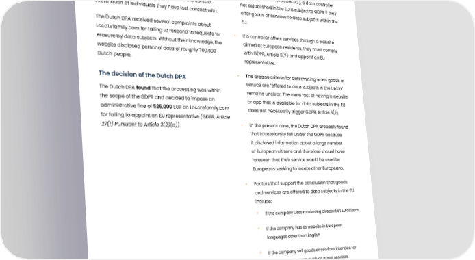 Locate Family fined for not appointing a representative Summary Our remarks Locatefamily.com is a non-EU based organization which • According to GDPR, Article 3(2), a data controller offers a platform enabling users to find the contact not established in the EU is subject to GDPR if they information of individuals they have lost contact with. offer goods or services to data subjects within the EU. The Dutch DPA received several complaints about Locatefamily.com for failing to respond to requests for • If a controller offers services through a website erasure by data subjects. Without their knowledge, the aimed at European residents, they must comply website disclosed personal data of roughly 700,000 with GDPR, Article 3(2) and appoint an EU Dutch people. representative. The decision of the Dutch DPA • The precise criteria for determining when goods or service are “offered to data subjects in the Union” The Dutch DPA found that the processing was within remains unclear. The mere fact of having a website the scope of the GDPR and decided to impose an or app that is available for data subjects in the EU administrative fine of 525,000 EUR on Locatefamily.com does not necessarily trigger GDPR, Article 3(2). for failing to appoint an EU representative (GDPR, Article 27(1) Pursuant to Article 3(2)(a)). • In the present case, the Dutch DPA probably found that Locatefamily fell under the GDPR because it disclosed information about a large number of European citizens and therefore should have foreseen that their service would be used by Europeans seeking to locate other Europeans. • Factors that support the conclusion that goods and services are offered to data subjects in the EU include: ° If the company uses marketing directed at EU citizens ° If the company has its website in European languages other than English ° If the company sell goods or services intended for European customers, such as travel services. Published: 14-01-2022, Journal number: N/A Tags: 03 Right to erasure and rectification Published: 10-12-2020, Journal number: n/a Tags: 07 Scope of the GDPR 25
