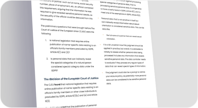Is information about private relations sensitive personal data? Summary Our remarks Under the Lithuanian anti-fraud law, officials were • There is generally a prohibition against processing required to provide information about their spouse, special categories of personal data. Prior to cohabitant, or partner. such as full name, social security processing sensitive personal data, it is imperative number, place of employment, etc. An official contested to have a lawful basis in GDPR, Article 6(1), and to this requirement, arguing that the information he was meet one of the exemptions in GDPR, Article 9(2). required to give revealed sensitive personal details, as the sexuality of the official could be deduced from this • Personal data that is not sensitive in itself but information. can indirectly reveal information about sexual orientation is considered sensitive data. This can be The preliminary questions that were brought before The data like: Court of Justice of the European Union (CJEU) were the following: ° The full name of a partner that can reveal sexual orientation. 1. Is national legislation that requires online publication of name-specific data relating to an • It is a bit uncertain how this judgment should be official’s family members precluded by GDPR, applied in practice, but overall, it is advisable to Article 6(1) and (3)? initially to assess whether personal data being processed includes any information that reveals 2. Is personal data that can indirectly reveal sensitive personal data. The data controller needs the special categories of a natural person to evaluate if they process any regular types of considered special category data under the data that can reveal special types of information. GDPR? • The judgment could also be a prompt to rethink The decision of the European Court of Justice your erasure policy, as potentially more personal data can be considered to be sensitive personal The CJEU found that national legislation that requires data. online publication of name-specific data relating to an official’s family members or other close individuals is precluded by GDPR, Article 6(1)(c) and (e) and Article 6(3). The CJEU also ruled that the publication of personal data which indirectly discloses someone’s sexual orientation constitutes the processing of special categories of personal data under GDPR, Article 9(1). Published: 01-08-2022, Journal number: N/A Tags: 01 Basis and principles of processing 134